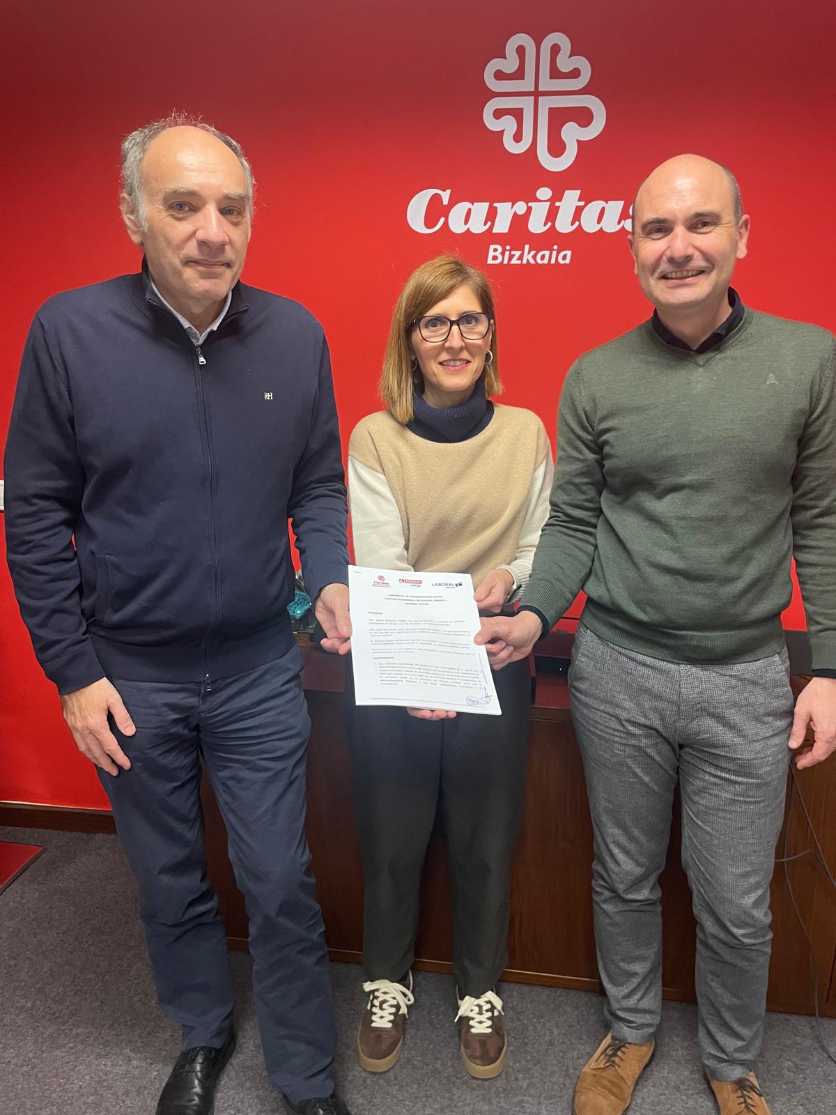Foto: Alejandro Martínez Berriochoa, director de Salud y Sostenibilidad de Eroski; Elena Unzueta, directora de Cáritas Bizkaia; Álvaro Parro, responsable de Comunicación y Acción Social en Bizkaia de LABORAL Kutxa.